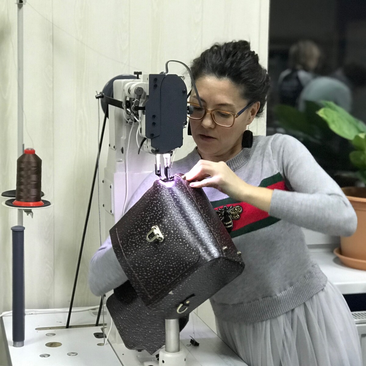В классе есть как прямострочки с шагающей лапкой и двойным и тройным продвижением, так и рукавная и колонковая машины для сборки объёмных конструкций. Утончаем кожу на машине для спуска края. Фурнитуру устанавливаем прессом.